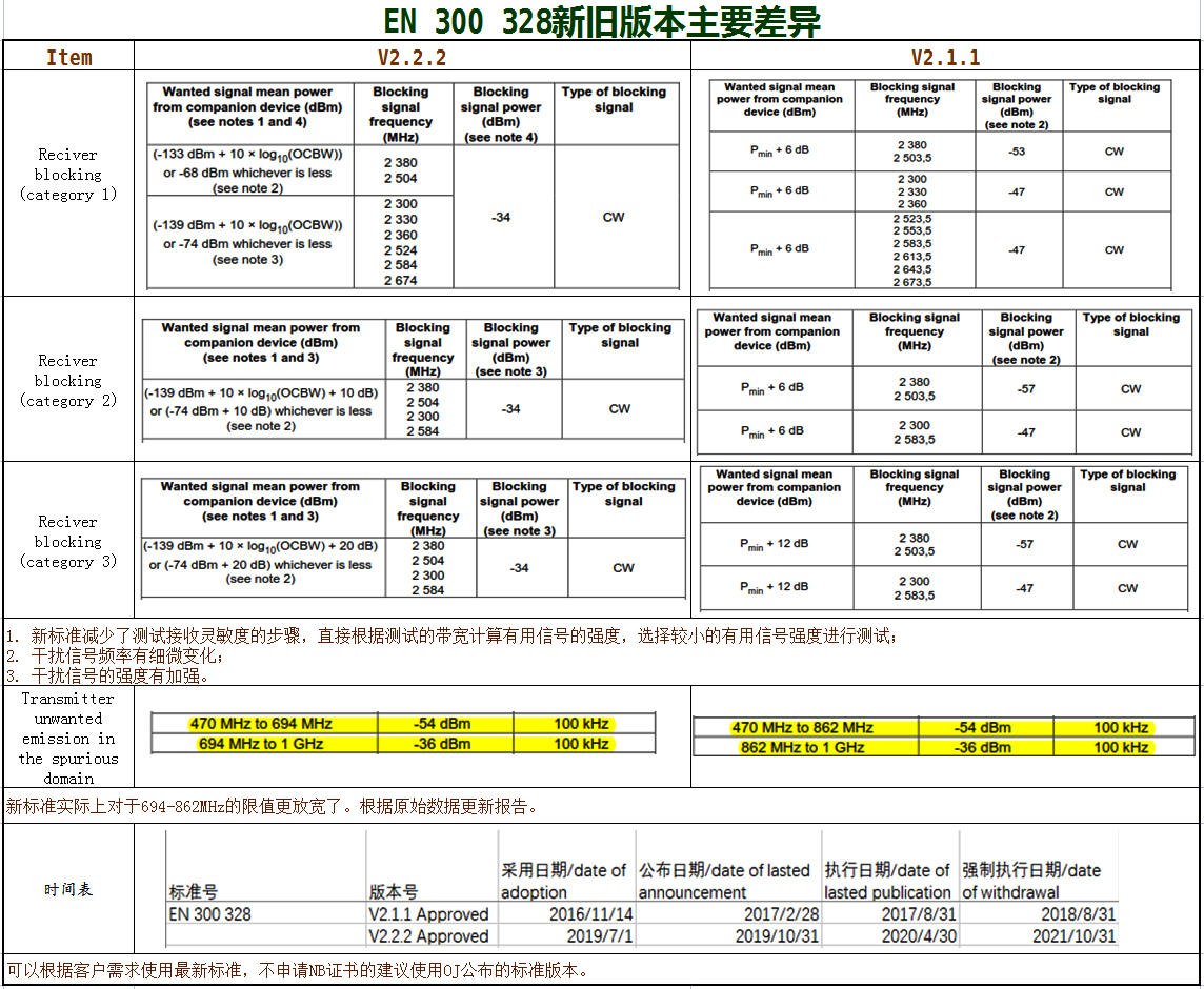 欧洲电信标准协会(ETSI)于2019年7月正式发布了EN 300328 V2.2.2版本,疑问和解读版本各异。以下是EN 300328新旧版本的对比表,剖析主要技术要点:
