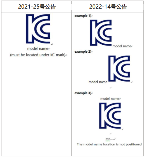 旧版公告要求型号名标注在KC logo下方,新版无要求参考如下对比: