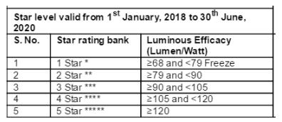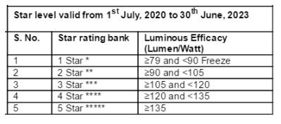 Please be informed that BEE( Bureau of Energy Efficiency) has revised the star level of the self-ballasted LED lamps shall be determined on the basis of star level parameters, luminous flux(lumens), wattage (watts) and luminous efficacy (lumen/watt), which shall be obtained from Form 1 or Form 2, depending on the year of manufacturing or import or sale as specified in two forms. The luminous efficacy (lumen/watt) shall be used to determine the star rating band and star rating of model. The star level plan shall be reviewed every three years.