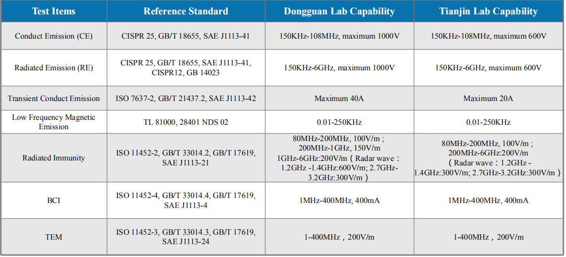 DDT Automotive Electronics Laboratory has a customized anechoic chamber for automobile electronics,2 electromagnetic shielding rooms, a full set of CISPR 25 automotive electronic components space radiation and conduction testing equipment, a full set of ISO11452-2 automotive radiation immunity testing equipment.full set of ISO 11452-4 BCI testing equipment, full set of ISO 11452-8 magnetic field immunity testing equipment, full set of ISO 16750-2 equipment,full set of ISO 7637-2/-3 automobile electronic transient emission and conducted immunity testing equipments,full set of ISO 11452- 9 portable transmitter testing equipment and others. The laboratory has a maximum test voltage of 1000V and a maximum test current of 800A.