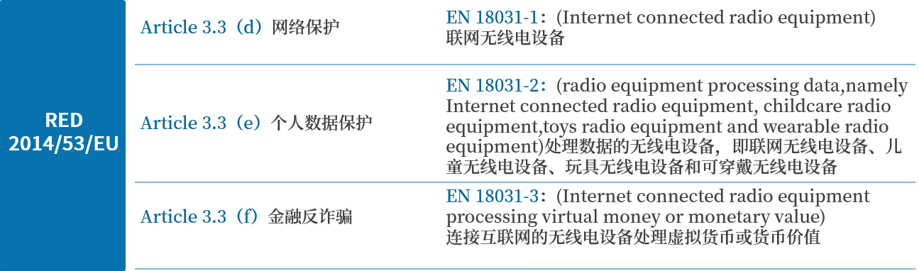RED 2014/53/EU,即无线电设备指令(The Radio Equipment Directive),是欧洲针对无线产品的一项认证指令,Article 3.3(d\(e\(f 中,规定了网络安全的要求内容: