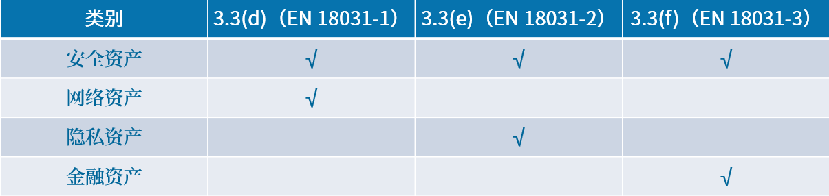 其中安全资产在三个标准中均有要求,而其他三种分别对应EN 18031-1/2/3三个标准,根据资产类型有不同的侧重点。
